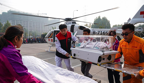 10月22日上午,伴隨著直升機(jī)的轟鳴聲,一架載著一名病情危重新生兒的999專業(yè)航空醫(yī)療救援直升機(jī)落在北京兒童醫(yī)院順義婦兒醫(yī)院,隨后患兒被緊急轉(zhuǎn)往北京兒童醫(yī)院,這是北京兒童醫(yī)院與999急救中心再次強(qiáng)強(qiáng)聯(lián)合開展空地一體化新生兒救援演練,這也將標(biāo)志著全國(guó)首家固定翼、直升機(jī)、急救車立體化新生兒轉(zhuǎn)運(yùn)體系的建成,為北京周邊地區(qū)及全國(guó)的新生兒轉(zhuǎn)運(yùn)開辟了更加暢通的綠色通道。
