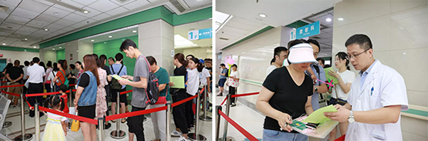今年入園體檢被安排在婦幼保健院院區(qū)內,鑒于以往的經驗,經院領導和科室負責人及相關人員數(shù)天的努力,設計出一套合理的入園體檢流程。7月25日,提前發(fā)布微信文章“兒童入園體檢攻略”,讓體檢寶寶家長們有了充足的心理準備,了解了體檢前需要準備的東西及抽血注意事項,大大減少了家長來回往返醫(yī)院的次數(shù)。在體檢流程上,也完善很多。每名兒童均有一名家長帶領,6人一組,在導醫(yī)指引下,有條不紊地進行心肺聽診、聽力篩查、視力篩查、抽血檢查,大大減少了等待的時間。同時抽血3個套餐供家長們選擇,套餐一為必查項目+乙肝五項,套餐二為必查項目+微量元素,套餐三為必查項目+乙肝五項+微量元素,這樣更加合理化,自愿化。